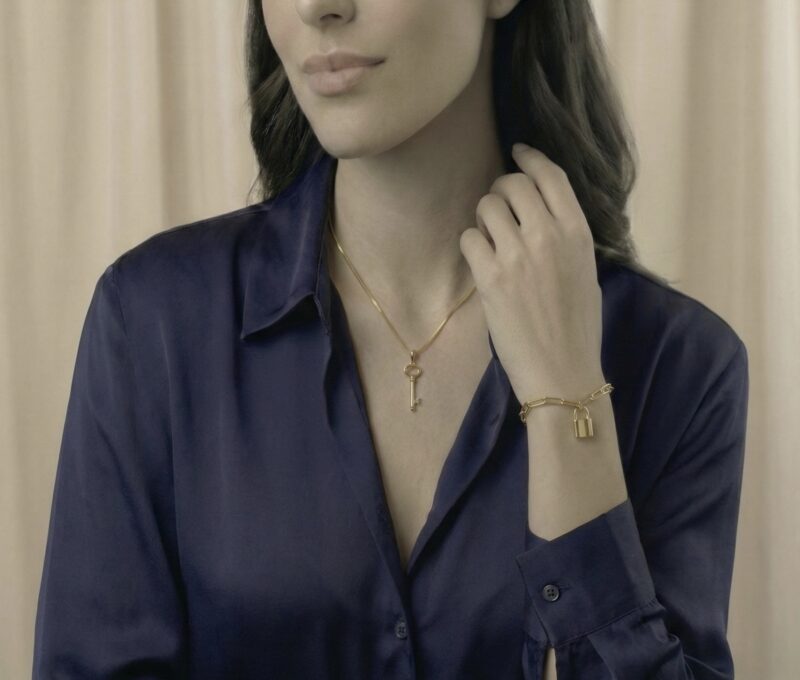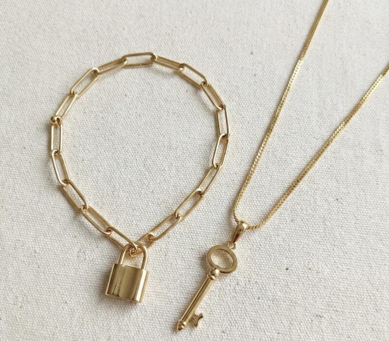 Unlock elegance with “The Gold Loft’s” exquisite Gold Lock and Key Set, a timeless symbol of love and security. This trendy, minimalist set, crafted from approximately 3 grams of pure gold, includes a chic paperclip chain bracelet with a delicate lock charm and a matching necklace with a simple key pendant.