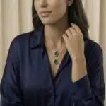 Featuring two delicate gold-tone chains, this necklace showcases two exquisite pear-shaped Emerald Green stones, each surrounded by a halo of sparkling crystals. Whether paired with a chic western top or a classic solid Kurta, this necklace adds just the right amount of sparkle without being overpowering.