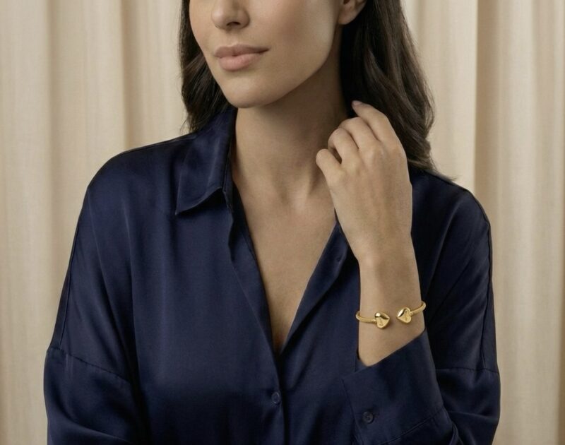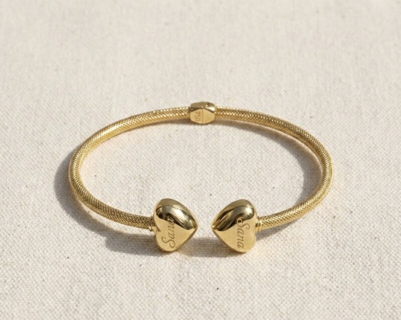 Weighing approximately 9 grams, this bangle offers a solid, heavy feel that mimics real gold, making it the perfect “hero piece” for your wrist. The design features a sophisticated textured mesh band ending in two bold, polished gold hearts. Its open-cuff style ensures a comfortable fit for most wrist sizes while making it incredibly easy to slip on and off.